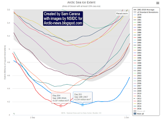 Arctic sea ice extent may well decline further over the coming days. The image on the right shows a temperature anomaly forecast for September 24, 2016. This gives an idea of the temperature anomalies that can be expected over the Arctic Ocean over the upcoming week. Temperature anomalies over the Arctic as a whole will be above 2 degrees Celsius for almost that entire period.
